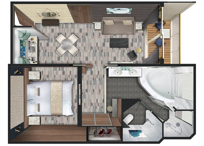 | SB - Aft-facing Owners Suite 56 m² / balkón 6 m². Vírivka. 9. paluba - vzadu. Max 2 osoby. Výhody Suite. | 32 330 € 16 165 € za osobu | ||