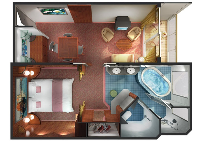 | SC - Forward-facing Deluxe Penthouse Suite 51 m² / balkón 10 m². Vírivka. 10. paluba - vpredu. Max 3 osoby. Výhody Suite. | 22 060 € 11 030 € za osobu | ||