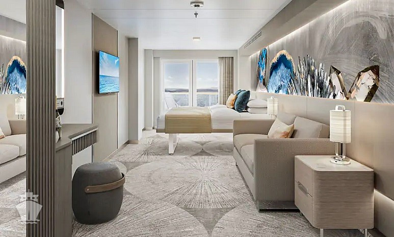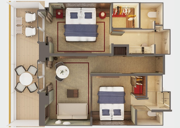 | SH - Suite s veľkým balkónom Aft-Facing 58 m² / balkón 34 m². 9. paluba - vzadu. Max 4 osoby. Výhody Suite. | 8 182 € 4 091 € za osobu |