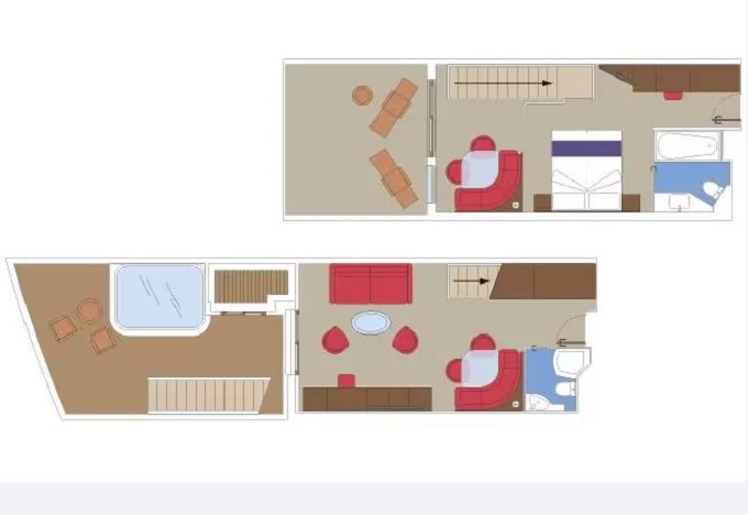 | YJD - Yacht Club Duplex Suite s vírivkou 46 m² + balkón 30 m². Vírivka. 2 podlažia, šatník, 2 kúpeľne (1 s vaňou). Max 4 osoby. 16. paluba. Cenový model MSC Yacht Club. | 10 452 € 3 484 € za osobu | ||