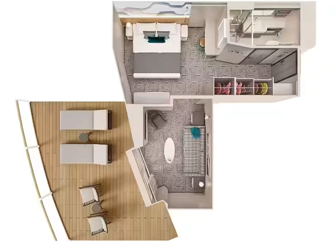 | SH - Suite s veľkým balkónom na korme 25 m² / balkón 34 m². 9. paluba - vzadu. Max 4 osoby. Výhody Suite. | 9 486 € 4 743 € za osobu | ||